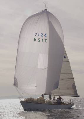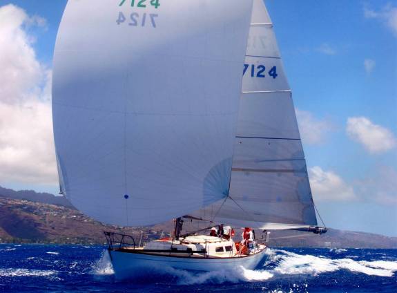 Sails: All by North. 3DL Main. 3DL 155, . .6 Poly primary chute. .5, .75, and 1.5 Nylon back-ups. As our local PHRF does not penalize Asymetrics, I’ve recently ordered a 1.5 Asymetric from North. Kevlar-Mylar #2 (140%).Our current favorite is the 7 oz Dacron, full-hoist “blade”, which is sheeted to the middle of the deck, just aft of the mast. I this seems to be the perfect sail for 14 kts+ TWS 18-20 AWS.However, you can only sheet such a sail if you remove the forward lowers. We have a full set of cruising sails, so we wash and fold the “good stuff” after racing (we even fold the spinnakers) so they last a long time.