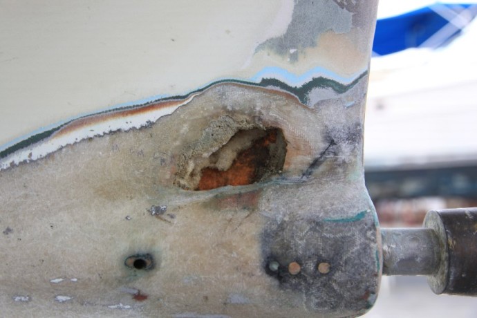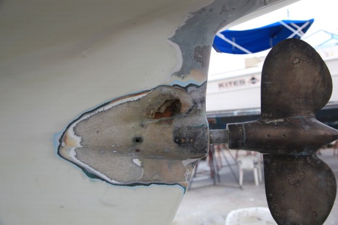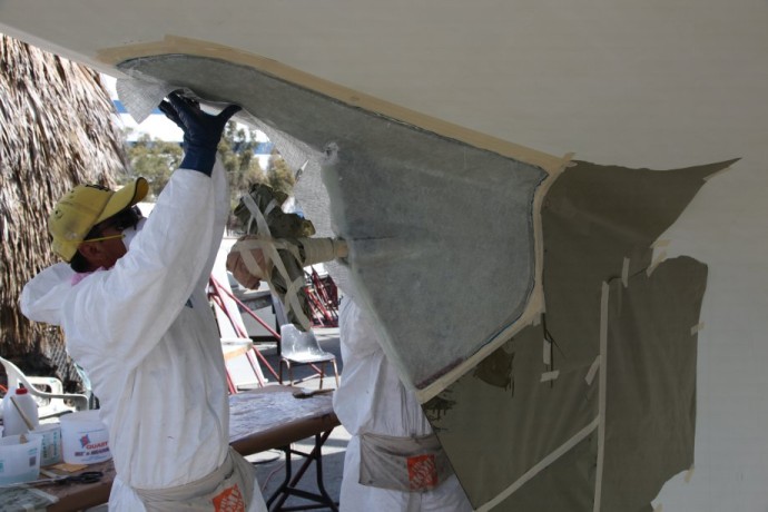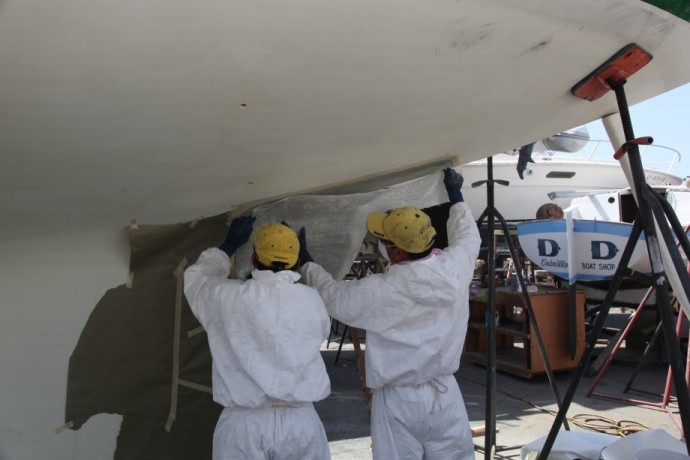 Stern Repair "On Illusion, early in the period when we owned her, we noticed water weeping into the bilge from that area, and when the boat was hauled out, we noticed some areas between the hull and the shaft log that were slow to dry. Illusion had the fiberglass shaft log from the beginning, so that wasn't the problem. We ground into that area from the outside and found very poor glass work and lots of "bog" with no glass. Understandably it is so skinny back there that it was hard to do a good layup into the female mold when the boats were built. From the outside we ground out all of the lousy glasswork and bog in that area, back to solid laminate, and then re-laminated from the outside with epoxy. It was easier than it sounds because working from the outside there is easy access. I think it is worth fixing properly and I'd consider it to be a possible structural problem. As I understand, some folks believe that Tangent was lost because she came apart in this area, but of course nobody really knows. It was a surprisingly easy fix working from the outside." And what Doug Jurius wrote about his repairs with Belle Aurore And what Kenny Keefe ( owner of KKMI shipyard in San Francisco, http://www.kkmi.com/ ) wrote about our situation. He did similar work on Gone with the Wind: "In my experience, there have been problems with the center seam in the boat. Partly due to old age and partly due to the way the boat was built. My bet is somewhere along the center line joint from the rudder post to the aft edge of the keel fin, there is a crack / defect that is letting the water in the boat. Then the tricky part is that it travels between the layers of fiberglass an comes out is some random spot inside the boat. For example, it could be leaking at the shaft log / tube, the water finds its way in the and then runs down a void and exits somewhere, on the inside aft seam in the keel." As I have admired his work for many years, I turned to Alan Andrews (Naval Architect, http://www.andrewsyacht.com/ ) to determine what would be the most appropriate fix for Radiant. Alan's Findings "The laminate in this area is very thin….Over time and with prop loads, it appears this is just too thin for what is essentially both the prop strut and what the boat is set on when hauled. The existing laminate appears to be just Mat, Cloth, Mat, Cloth, Roving and less than 1/8" thick. The laminate specified here should be about .36 inches thick …. The result may mean removing more of the laminate above the shaft tube and below the hull in order to build this thickness further towards centerline and still keep the fair keel shape. (Increasing the thickness but keeping the original outside shape)." Because Dennis Choat has more experience working with fiberglass than anyone I know, I trusted that Dencho would be best for the repairs. http://www.denchomarine.com/ It's a funky yard, but I've always been treated well by Don Holland at Cabrillo Boat Yard, so that's where the boat was hauled. http://www.cabrilloboatshop.com/. Also, it's only about 2 miles from the Dencho shop. As this could possibly occur on any Cal-40, I thought you might find these pictures interesting. They started on Thursday, and this is where they were at about 10 am on Friday. I'll take more pictures later today, and will pass them along.